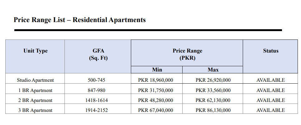 Price Range List – Residential Apartments
